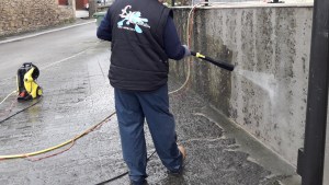 Limpieza de muros con hidrolavadora de alta presión.